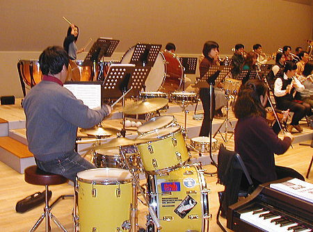 映画音楽「ミッション・イン・ポッシブル」リハーサル中の一コマ。ドラムス・ティンパニ・ボンゴ(譜面台が邪魔)の打楽器群に、管楽器のメロディーが乗っかって、めちゃくちゃカッコいい。あの曲って5拍子だったのですね。
