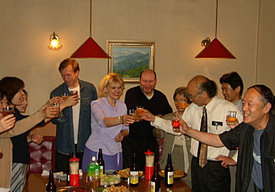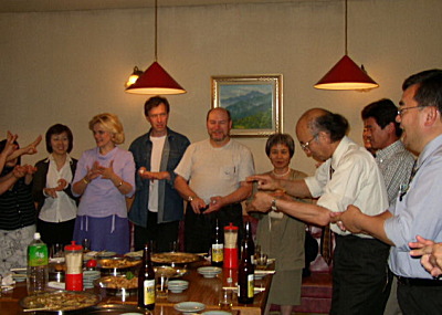 打ち上げの〆。本来これを「一本締め」って言うらしい、三三七拍子じゃなくて、三三三一でたたくやつ。「三が三つで九、一つ足して丸く収める」っていう意味があるらしいんだけど。それを一本指から二本、三本と増やして五回目の最後で終わるやつ。俗に「音大締め」って言ってたこともあるけど、正しくはなんて言うんだろう?とにかく、コレで締めたところ、シャーリナさんがいたくお気に入りの様子。「クライマックスへの盛り上げ方が素晴らしい」とのこと。ぜひアンコールを、と言われ、異例の〆くり返しをしてしまったのでした。